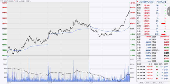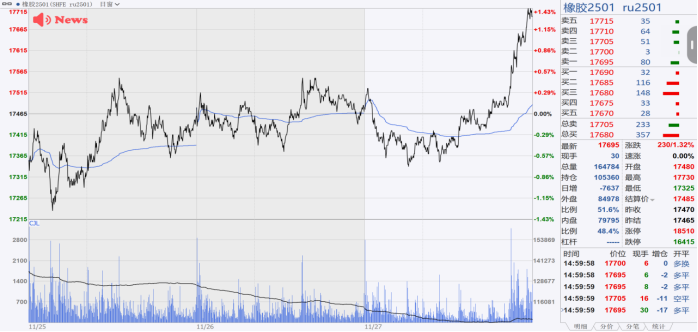 国内现货方面:截止11月27日国内橡胶现货价格,泰混人民币现货报价16430元/吨,比昨日上涨200元/吨;