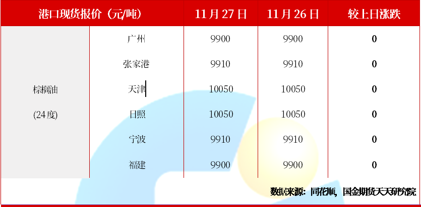 11月27日,广州棕榈油(24度食用精炼)报价每吨9900元,张家港报每吨9910元,天津报每吨10050元,日照报每吨10050元,福建报每吨9900元,宁波报每吨9910元;