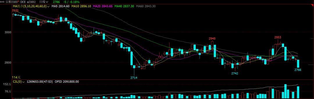 从上图豆粕期货M2505合约走势来看,日线级别呈现明显空头趋势,一根大阴线直接跌穿2800元/每吨整数价格一路下跌至2760元/吨附近,打破前期低点。