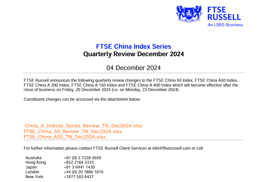 12月4日,富时罗素宣布对富时中国50指数、富时中国A50指数、富时中国A150指数、富时中国A200指数、富时中国A400指数的季度审核变更。该变更将于12月20日(星期五)收盘后生效。