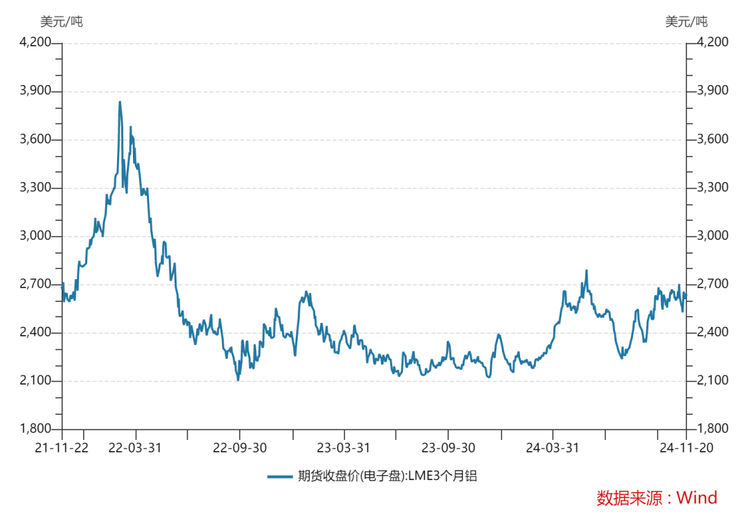 10月份海内外铝价走势略有分化,海外铝价维持高位宽幅震荡,国内铝价继续偏强运行,价格涨幅较上月有所减缓。LME铝现货月初价格为2635美元/吨,月末收于2617.5美元/吨,月末较月初下跌0.7%,报告期内最高价为2655.5美元/吨,最低价为2522美元/吨,全月均价2598.4美元/吨,月均价环比上涨6.0%,同比上涨18.5%;国内华东铝锭现货月初价格为20600元/吨,月末收于20780元/吨,月末较月初上涨0.9%,报告期内最高价为21080元/吨,最低价为20450元/吨,全月均价20741元/吨,月均价环比上涨5.4%,同比上涨8.5%。展望后市,海内外宏观中性偏多,供需矛盾仍不突出,高成本低库存形成强势驱动,预计后续价格高位震荡运行。