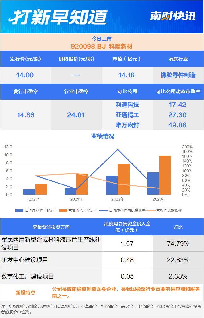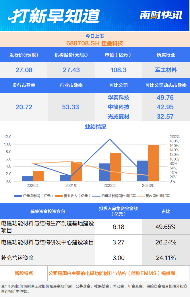 12月5日,有两只新股上市,为科创板的佳驰科技(688708.SH)和北交所的科隆新材(920098.BJ)。