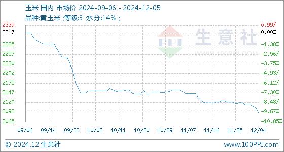 12月5日,生意社玉米基准价为2088.57元/吨,与本月初(2112.86元/吨)相比,下降了-1.15%。
