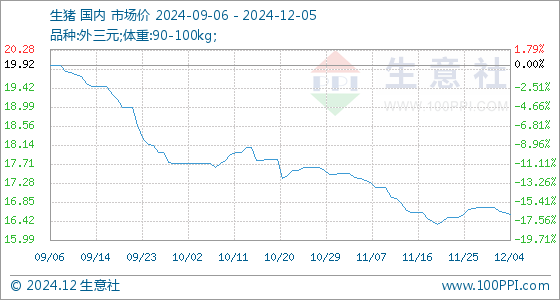 12月5日,生意社生猪基准价为16.57元/公斤,与本月初(16.72元/公斤)相比,下降了-0.90%。