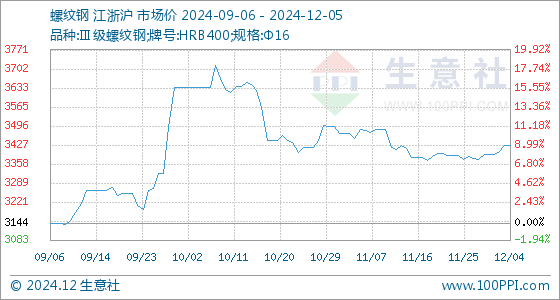 12月5日生意社螺纹钢基准价为3424.29元/吨