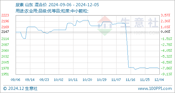 12月5日,生意社尿素基准价为1976.25元/吨,与本月初(1981.25元/吨)相比,下降了-0.25%。
