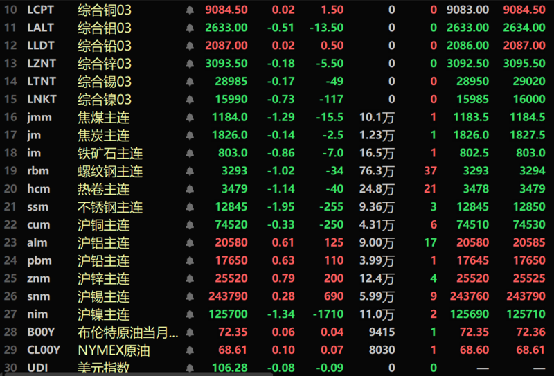 黑色系均飘绿,铁矿跌0.86%。螺纹、热卷分别跌1.02%、1.14%。不锈钢跌1.95%。双焦方面,焦煤跌1.29%,焦炭跌0.14%。