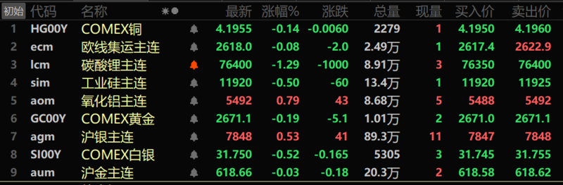 截至午间收盘,内盘基本金属普涨。沪镍跌1.34%,沪锡涨0.28%,沪锌涨0.79%,沪铅涨0.63%,沪铝涨0.61%,沪铜跌0.33%。氧化铝延续前3个交易日的涨势继续涨0.79%。此外,碳酸锂跌1.29%,工业硅跌0.5%。