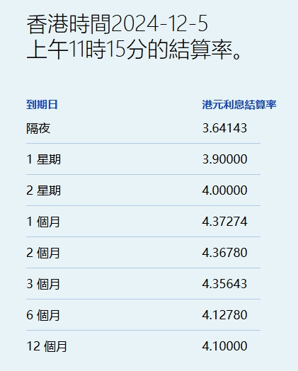港元拆息全线下跌一个月拆息结束七连升报4.37%