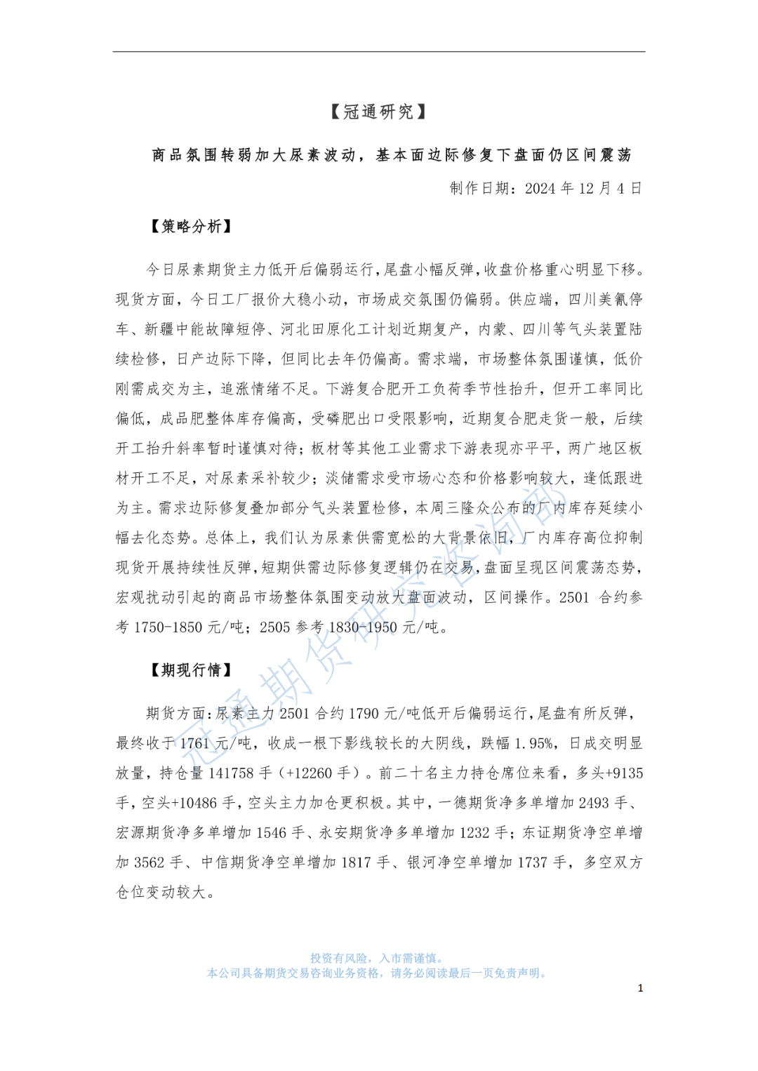 冠通研究--尿素策略:商品氛围转弱加大尿素波动,基本面边际修复下盘面仍区间震荡