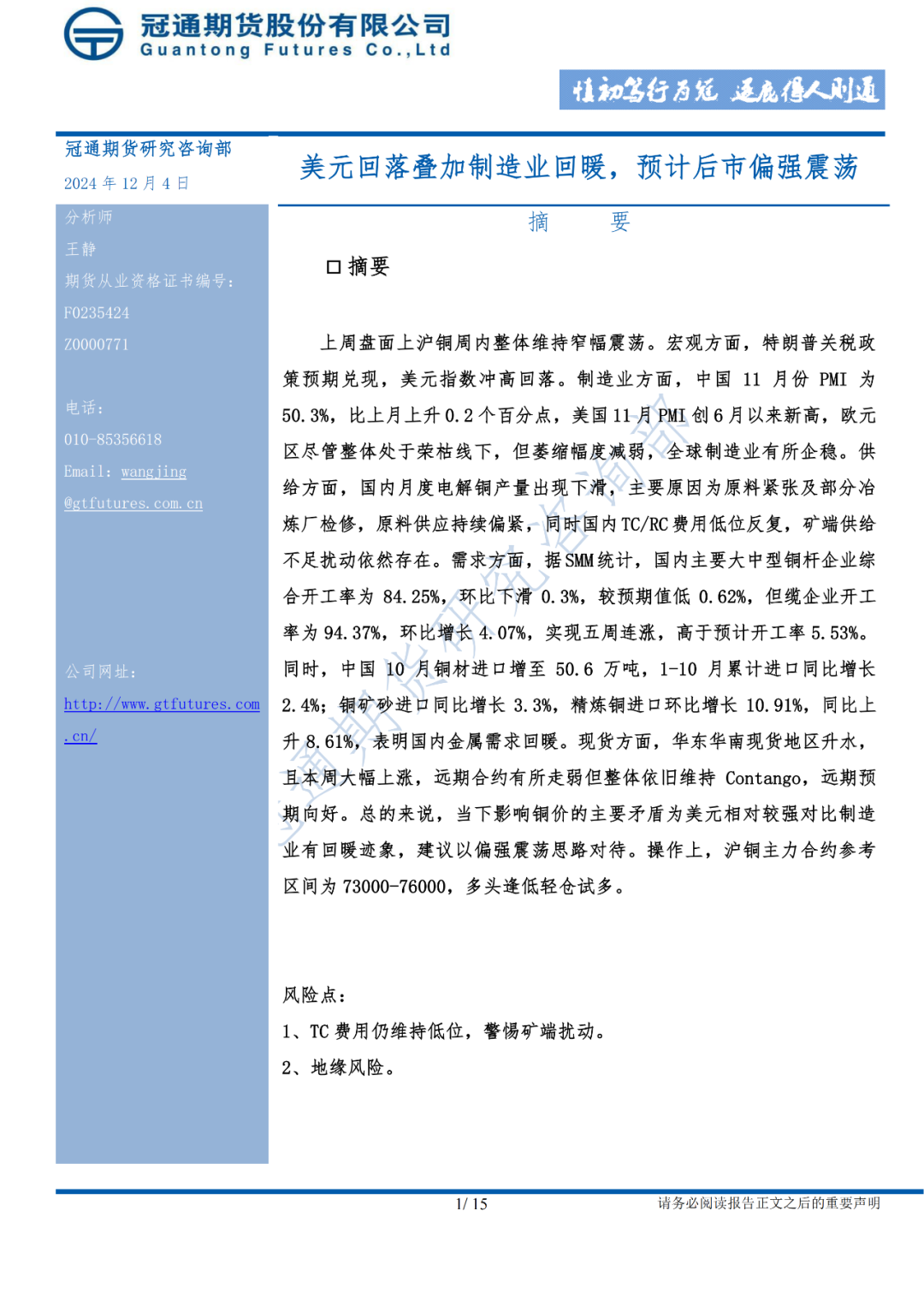 冠通研究--沪铜周度报告:美元回落叠加制造业回暖,预计后市偏强震荡
