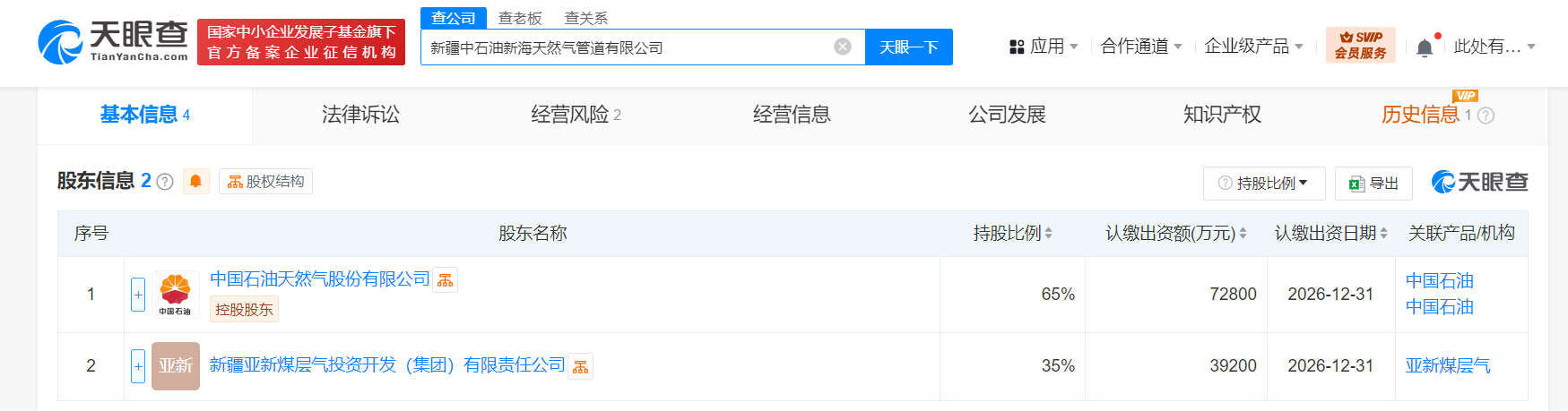 每经AI快讯,天眼查App显示,近日,新疆中石油新海天然气管道有限公司成立,法定代表人为邓斌,注册资本11.2亿元,经营范围为建设工程施工,发电业务、输电业务、供(配)电业务,以自有资金从事投资活动,陆地管道运输。股东信息显示,该公司由中国石油、新疆亚新煤层气投资开发(集团)有限责任公司分别持股65%、35%。