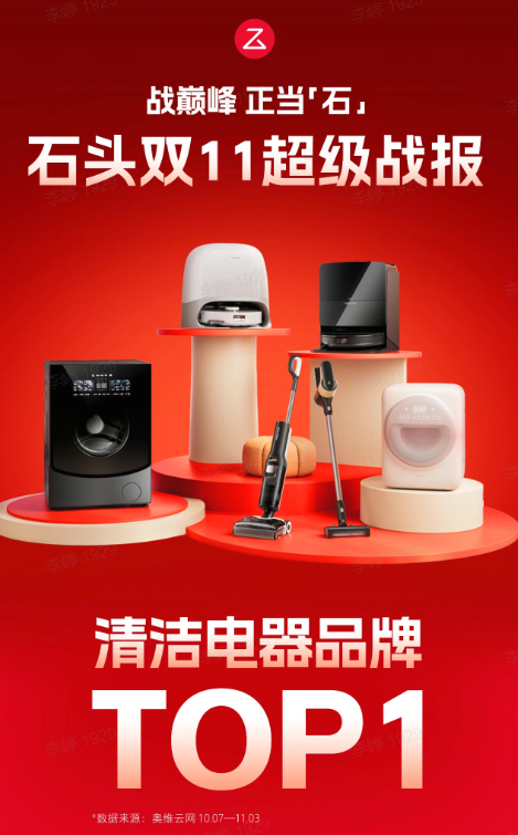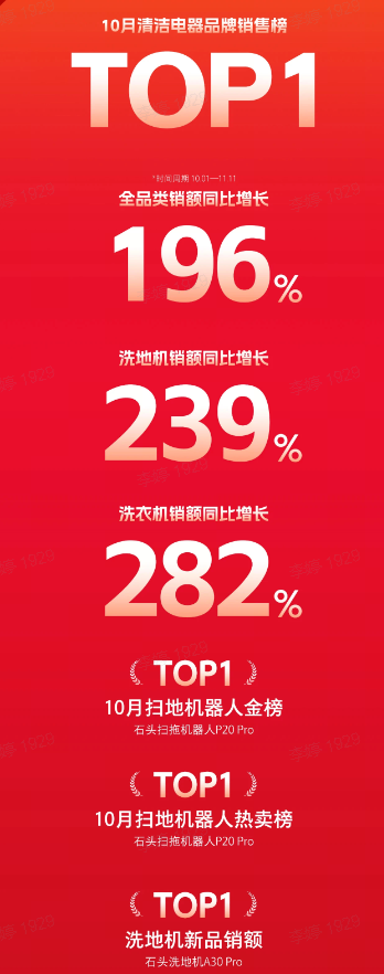据各大电商平台的数据显示,在京东平台上,石头科技全品类销售额同比增长196%,洗地机和洗衣机销售额分别同比增长239%和282%。旗舰产品扫拖机器人P20Pro同时位居“10月扫地机器人金榜”和“热卖榜”首位。在天猫平台上,石头科技的洗衣机销售额同比增长408%,其中,迷你洗烘一体机M1和分子筛洗烘一体机Z1跻身热销榜前列。在抖音平台上,扫地机销售额同比增长105%,洗地机和洗衣机销售额分别暴增2532%和12672%。G20S Ultra等核心产品在商品榜、品牌榜中名列前茅。
