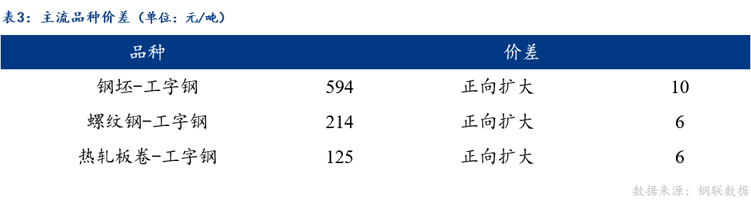 从品种价差来看,工字钢与钢坯、螺纹钢、热轧板卷的价差正向扩大。