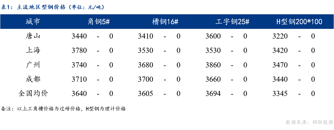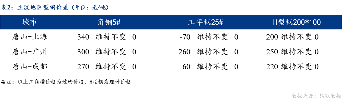 从区域价差来看,唐山到上海、广州、成都角钢、工字钢、H型钢价差维持不变。
