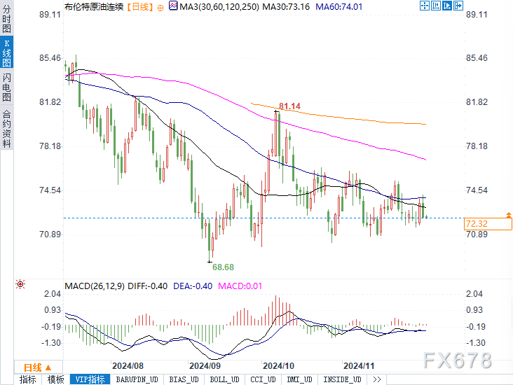 汇通财经APP讯——周四(12月5日)原油价格呈现小幅震荡,市场关注的焦点集中在稍晚召开的OPEC+线上会议以及近期地缘局势的变化。截至北京时间15:56,布伦特原油连续合约报价72.31美元/桶,微跌0.11%;美原油连续合约交投于68.60美元/桶,微涨0.09%。在前一交易日大幅下跌近2%后,油价进入盘整阶段,等待进一步指引。