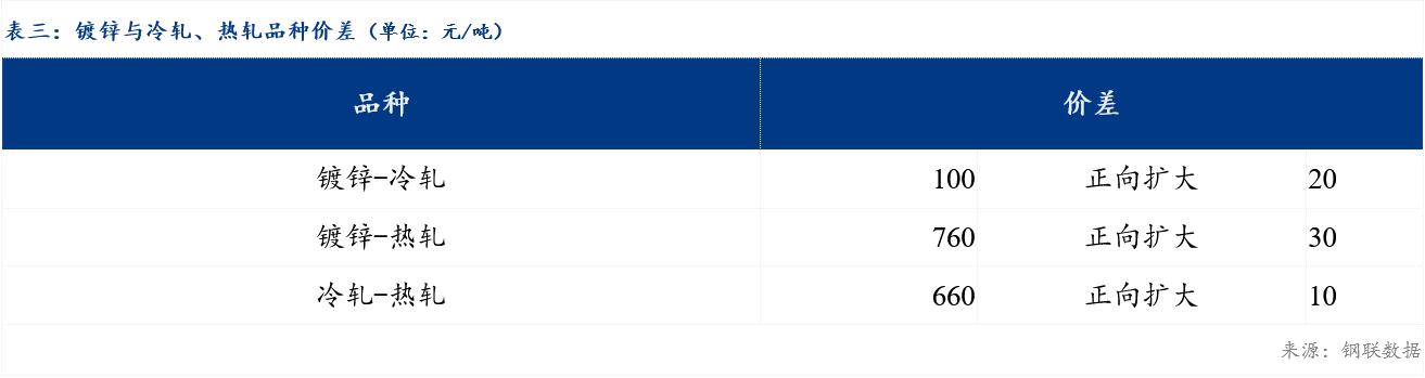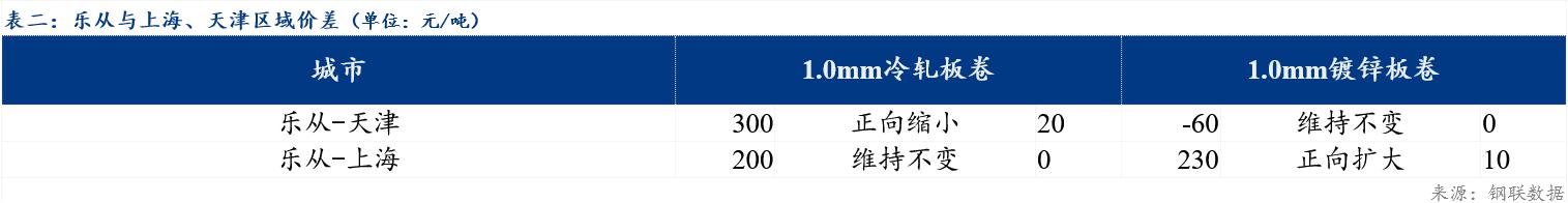 今日冷轧板卷乐从与天津价差较上一交易日收窄20元/吨,乐从与上海价差较上一交易日持平;镀锌板卷乐从与天津价差较上一交易日持平,与上海价差较上一交易日扩大10元/吨。品种价差方面,镀冷价差较上一交易日扩大20元/吨,镀热价差较上一交易日扩大30元/吨,冷热价差较上一交易日扩大10元/吨。
