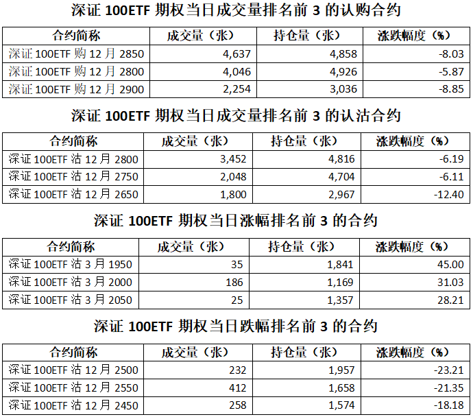深证100ETF期权总成交面额11.06亿元,减少20.80%,期现成交比为0.01,权利金成交额0.21亿元;期权总成交量39,154张,减少19.66%,其中认购期权成交量23,113张,认沽期权成交量16,041张,认沽认购成交比率为0.69(上一交易日认沽认购成交比率为0.56)。