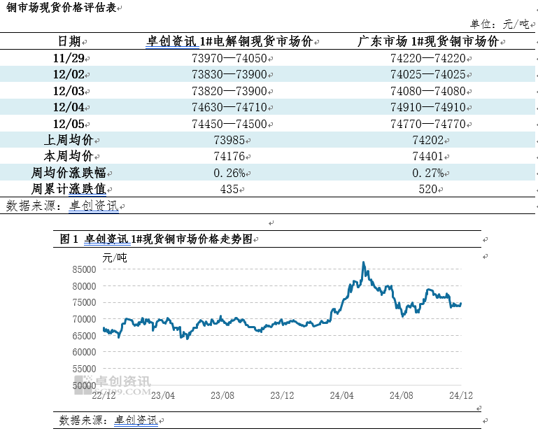 本周四卓创资讯现货铜价在74475元/吨,较上期上涨435元/吨,涨幅为0.59%,周均价为74176元/吨,较上期环比涨幅0.26%。