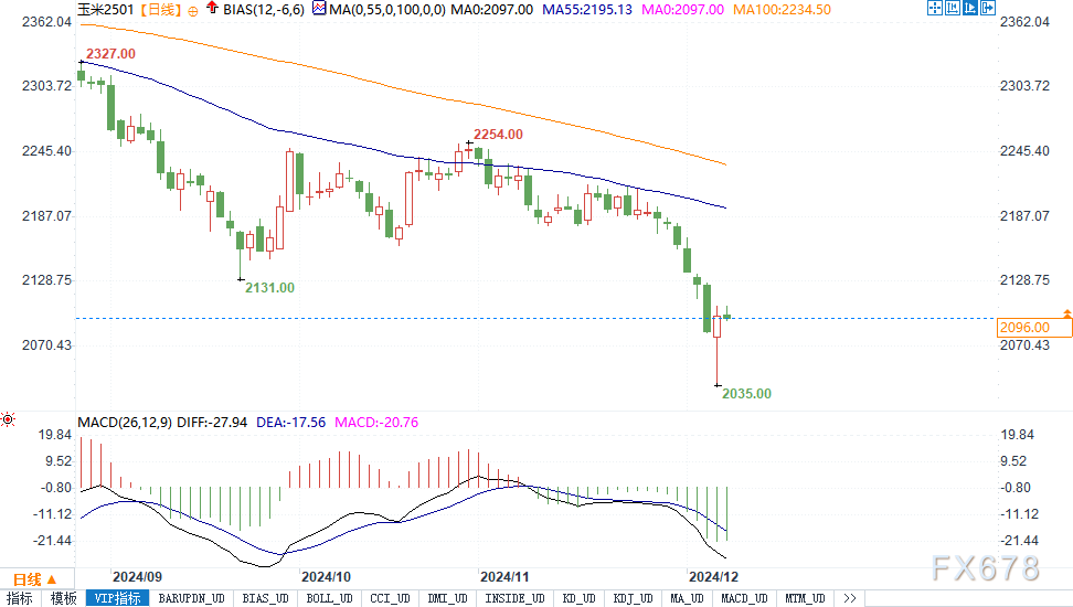北京时间12月5日21:23,玉米01合约报2096元/吨。