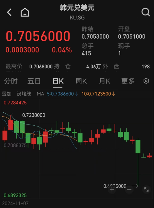 目前,韩国正处于政治僵局,再加上强势美元的扰动,韩元遭受双重压力,一度创下近年来最快速的贬值纪录。目前,韩元汇率有所回升,截至北京时间12月5日19时,韩元对美元汇率为1美元兑1418.4韩元,韩元汇率月内跌幅为1.64%。
