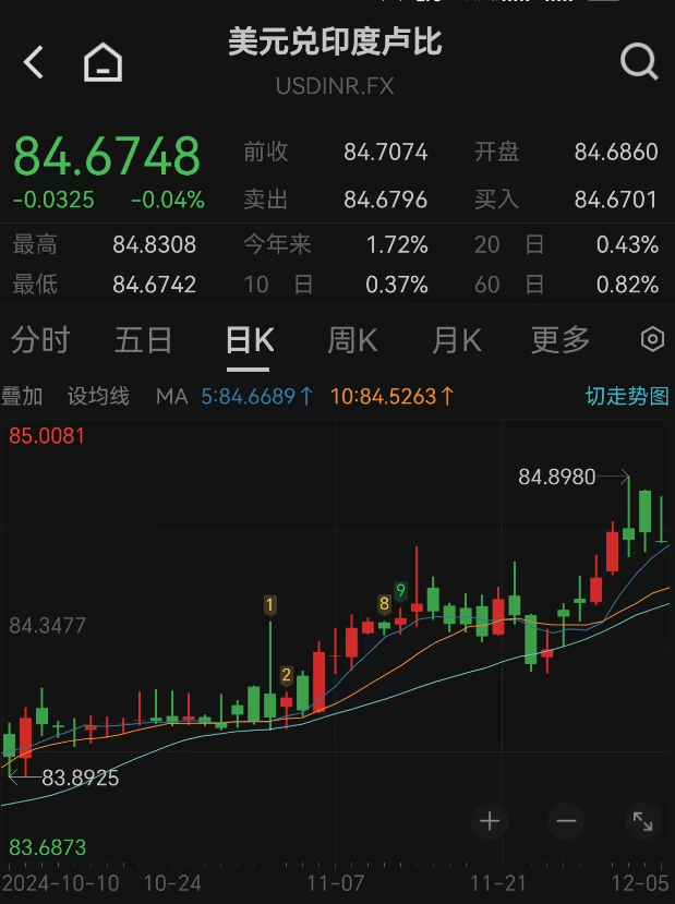 与印尼盾情况相似,其他亚洲货币也面临较大的贬值压力。12月3日,美元兑印度卢比日内最高报84.788,创出历史新高。截至12月5日,美元兑印度卢比为1美元兑84.7印度卢比。市场预测,印度央行可能在抛售美元以支撑卢比。数据显示,截至11月22日当周,印度外汇储备上演了有记录以来最大单周跌幅,至四个多月来的最低水平。