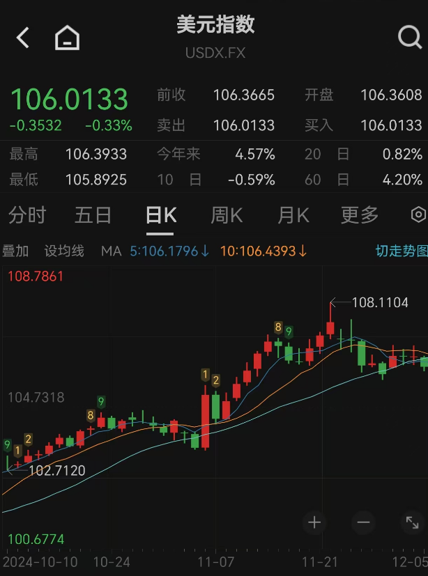 虽然当前美元略有回落,但仍处于高位。12月5日,美元指数下跌0.26%报106.05。汇率市场因“特朗普交易2.0”回归而承压,自11月初以来,美元指数累计上涨1.03%。