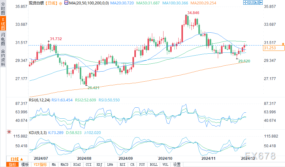 北京时间22:29,现货白银报31.247美元/盎司,跌幅0.07%。