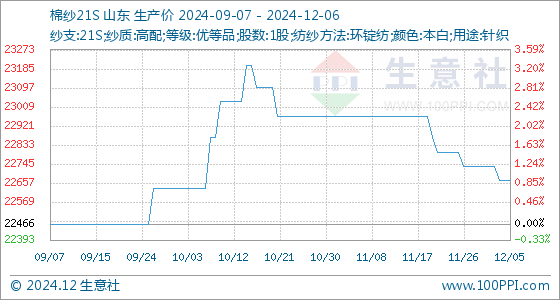 12月6日,生意社棉纱21S基准价为22666.67元/吨,与本月初(22733.33元/吨)相比,下降了-0.29%。