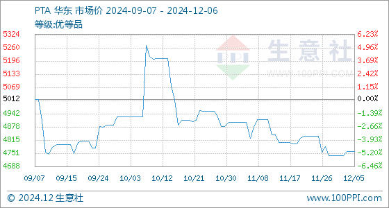 12月6日,生意社PTA基准价为4759.70元/吨,与本月初(4741.00元/吨)相比,上涨了0.39%。