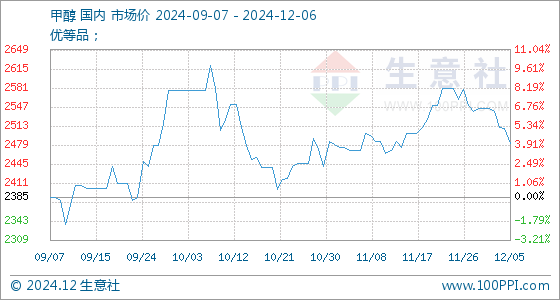 12月6日,生意社甲醇基准价为2482.50元/吨,与本月初(2544.17元/吨)相比,下降了-2.42%。