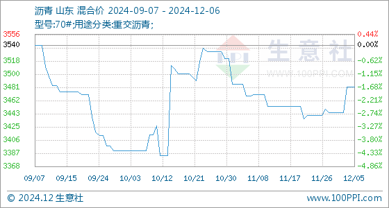 12月6日,生意社沥青基准价为3481.67元/吨,与本月初(3445.00元/吨)相比,上涨了1.06%。
