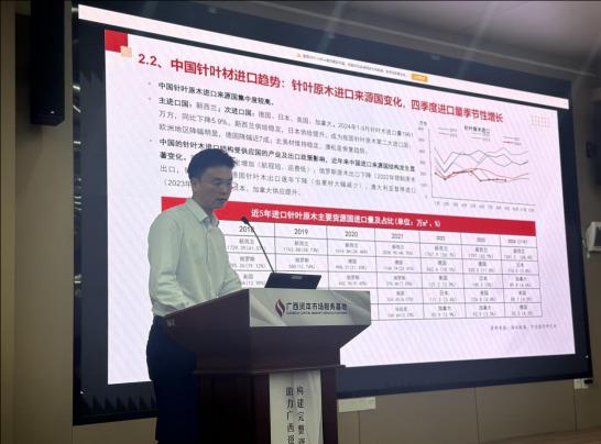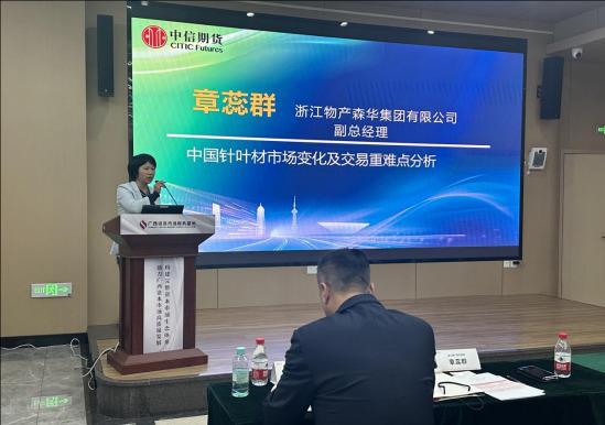 在会议中,三位专家围绕原木期货的相关议题进行了深入的分享。中信期货研究所农业组研究员周重廷首先介绍了原木期货的合规规则和定价框架,详细解读了期货市场的操作规范和定价机制,为与会者提供了操作原木期货的理论基础。紧接着,湖北福汉木业国际贸易有限公司常务副总经理杨隽分享了原木期货在产业企业经营和风险管理中的机遇与应用,阐述了如何利用期货市场对冲价格波动风险,帮助林业企业优化经营策略并稳定发展。最后,浙江物产森华集团有限公司副总经理章蕊群女士通过分析中国针叶材市场的变化,重点讲解了交易中的重难点问题,帮助企业更好地理解市场趋势与期货工具的应用,提升在复杂市场环境中的应对能力。