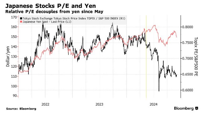 Watanabe表示:“自5月以来,投资者开始认为日元贬值将促使日本央行加快加息。这反过来又推低了日本股市的市盈率。”