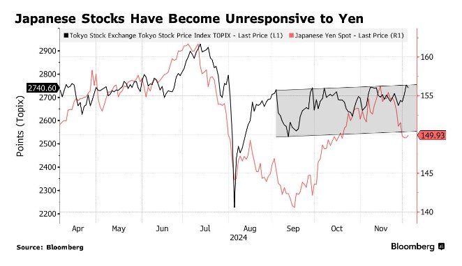 尽管日元兑美元汇率在9月中旬触及的14个月高点139.58和11月中旬触及的低点156.75(接近7月触及的38年低点)之间波动,但自夏季大跌以来,东证指数一直处于狭窄的交易区间。