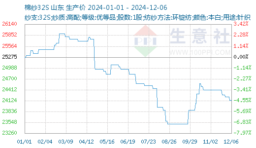 据生意社商品行情分析系统显示:本周下游需求有限,纱厂新接订单稀少,成品库存持续增加,纯棉纱价格小幅下调,截至12月6日,国内山东地区21S纯棉环锭纺现货参考价格在22667元/吨左右,较上周下跌0.29%;32S纯棉环锭纺现货参考价格在24125元/吨,较上周下跌0.41%。