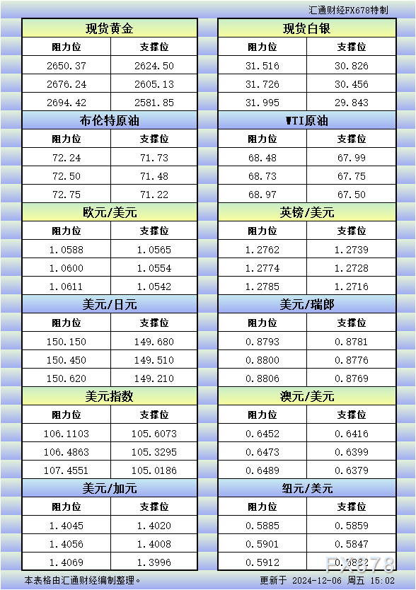 汇通财经APP讯——12月6日欧市更新的黄金、白银、原油、美元指数、欧元、英镑、日元、瑞郎、澳元、加元、纽元支撑阻力位一览。