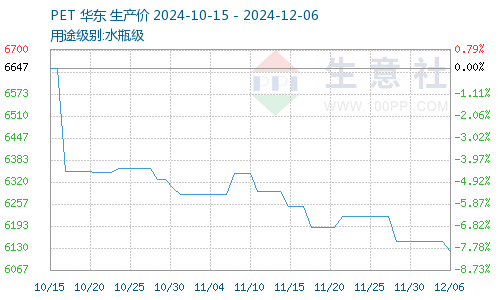 根据生意社商品行情分析系统显示,本周PET瓶片市场价格震荡偏弱运行。截至12月6日,其平均市场价格为每吨6120元,较月初均价下跌30元/吨,跌幅为0.48%。