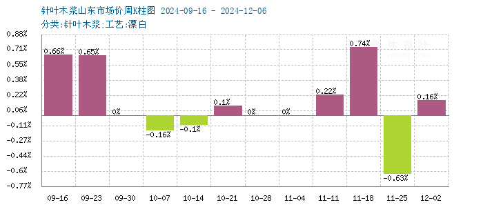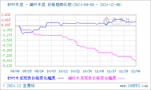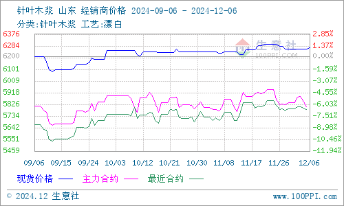 据生意社商品行情分析系统监测:本周针叶木浆价格小幅上探,阔叶木浆表现出跌跌不休之势。12月6日针叶木浆山东地区市场均价为6270元/吨,与12月1日均价相比上涨了0.16%。12月6日阔叶木浆山东地区市场均价为4478元/吨,与12月1日均价相比下降了1.41%。