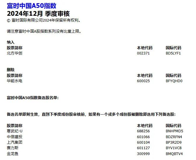 其中,市场关注度较高的富时中国A50指数本次调整纳入北方华创,剔除华能水电;备选股名单包括寒武纪-U、中信建投、上汽集团、赛力斯、金龙鱼。富时罗素表示,备选名单即刻生效,直到下季度成分股审核前,如果有一个或多个成分股被删除即选用前述备选股。