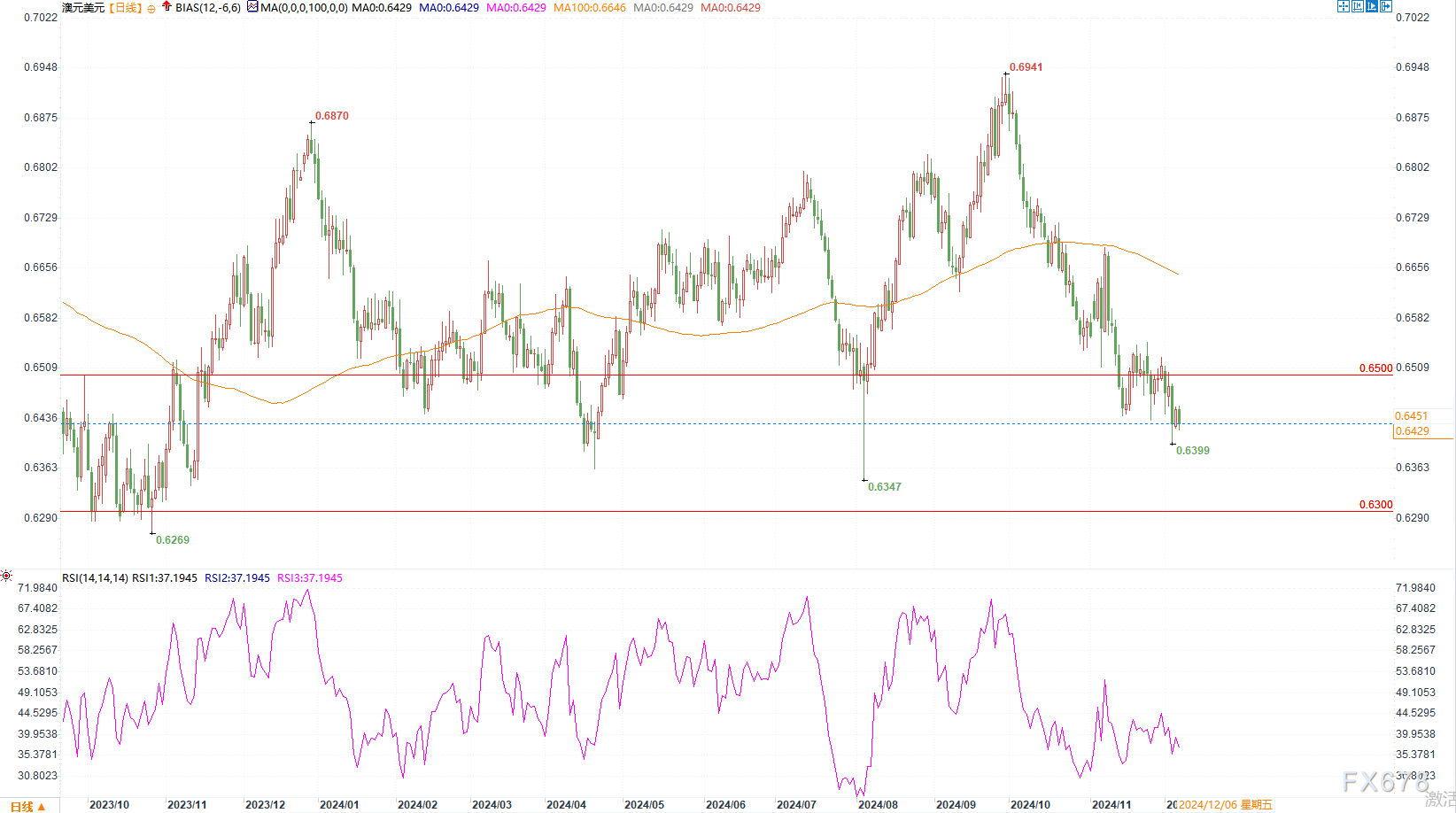 澳元近期表现疲软,周五(12月6日)盘面微跌0.37%,报0.6427。低经济增长可能促使澳洲联储在下周的货币政策会议上采取更鸽派的立场,可能为2月降息铺路。这反过来对澳元施加了一些卖压。