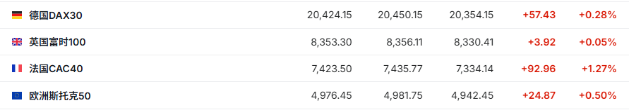 2. 截至发稿,德国DAX指数涨0.28%,英国富时100指数涨0.05%,法国CAC40指数涨1.27%,欧洲斯托克50指数涨0.50%。