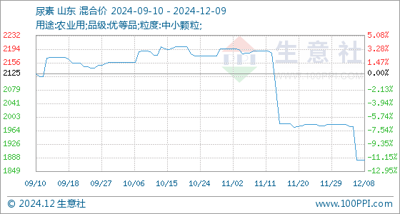 12月9日,生意社尿素基准价为1881.67元/吨,与本月初(1981.25元/吨)相比,下降了-5.03%。