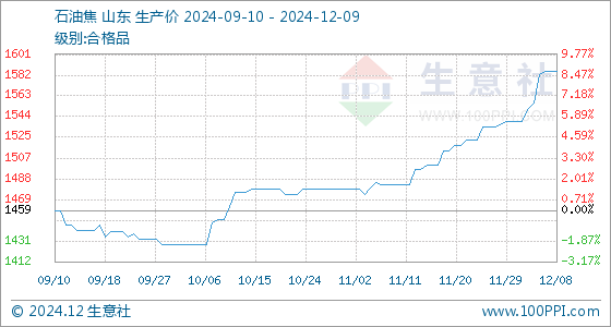12月9日,生意社石油焦基准价为1585.75元/吨,与本月初(1540.25元/吨)相比,上涨了2.95%。