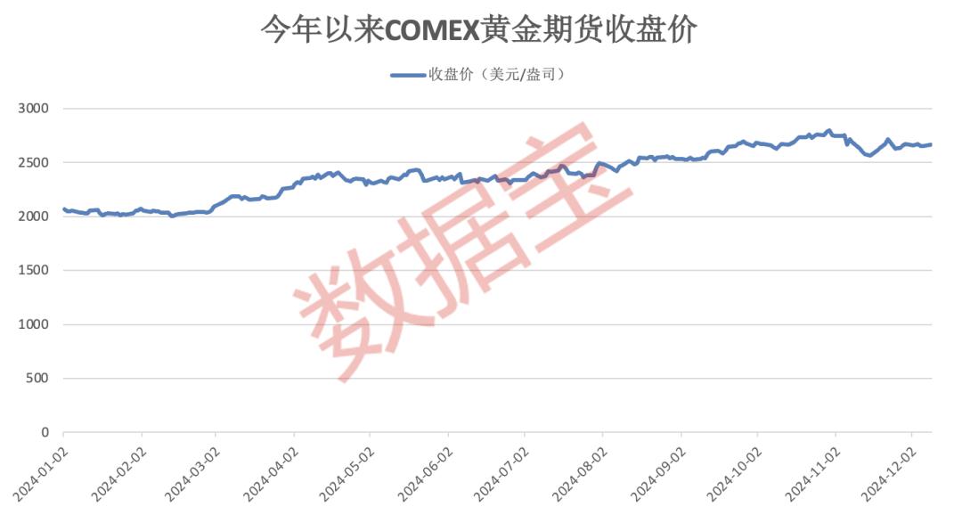 今年10月,黄金价格创下历史新高后,11月出现明显回调,每盎司价格最低触及2541.5美元。截至最新,COMEX黄金期货价格已较低点攀升,近几日横盘震荡在2665美元/盎司附近,较10月高点以来,COMEX黄金期货价格下降超4%,降幅有所收窄。