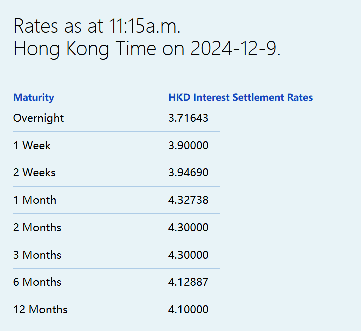 12月9日,港元拆息涨跌不一,隔夜拆息微升至3.71643%,而与楼按相关的一个月拆息结束两连跌,由一周低位略微回升至4.32738%。