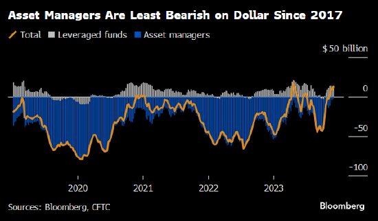 CFTC按货币划分的数据显示,在资产管理公司的头寸中,欧元占据的份额较大,多头头寸达到价值234亿美元,尽管已从2023年5月的640亿美元峰值回落。这些投资者看跌加元、英镑和瑞士法郎。