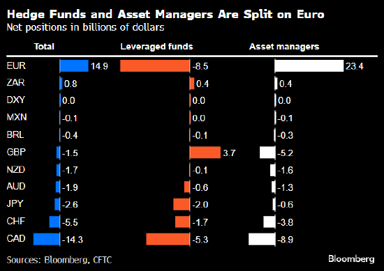 数据显示,杠杆基金合计持有144亿美元的美元多头头寸,主要是因为做空欧元和加元。这类投资者通常对不断变化的市场趋势更敏感。