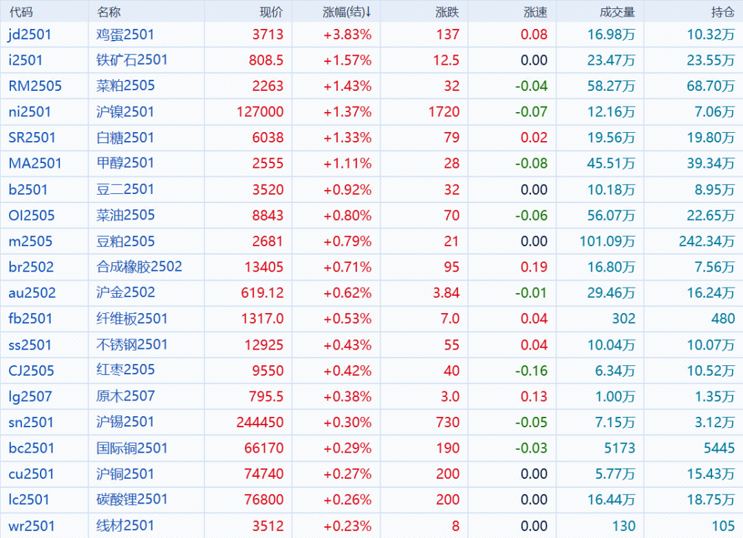 12月9日,午盘收盘,国内期货主力合约多数下跌。集运欧线跌超4%,焦煤、氧化铝跌超2%,苹果、20号胶、尿素、棉花、锰硅、工业硅跌超1%;涨幅方面,鸡蛋涨超3%,铁矿石、菜粕、沪镍、白糖、甲醇涨超1%。