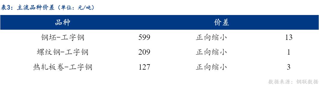 从品种价差来看,工字钢与钢坯、螺纹钢、热轧板卷价差正向缩小。